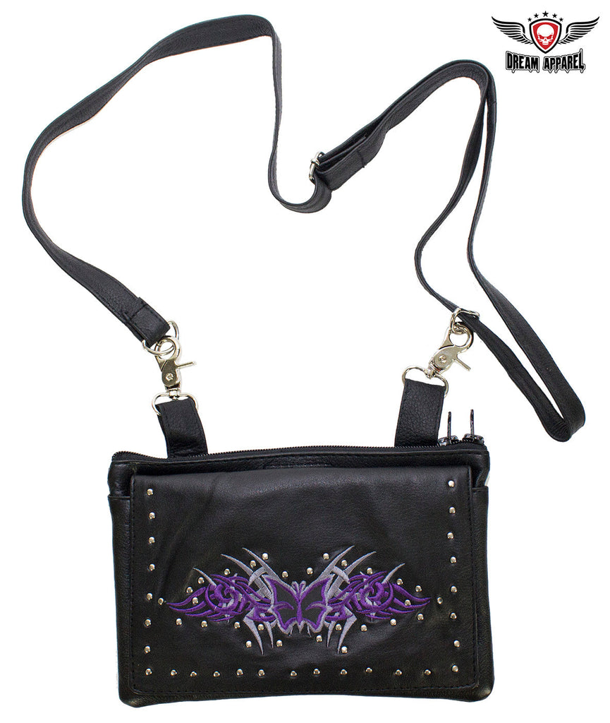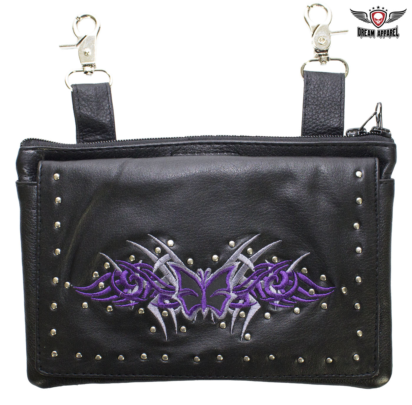 This beautiful 9" x 7.5" naked cowhide leather belt bag is the perfect bag for anyone that wishes to carry a large concealed handgun. The large zippered compartment has a strong Velcro strap inside to keep it secure until you're ready to use it. With a large dual magnetic flap pocket on front and an equally large zippered pocket on back you can carry a large cell phone and so much more. It attaches quickly and easily to your belt loops with the two large chrome lobster clasps. Finished with a black butterfly in a purple and silver graphic on the flap with chrome studs that border the flap and highlight the graphic you'll never ride unprotected again. Order yours today.