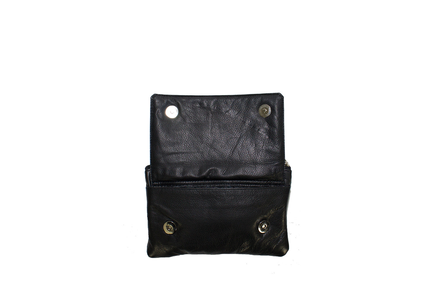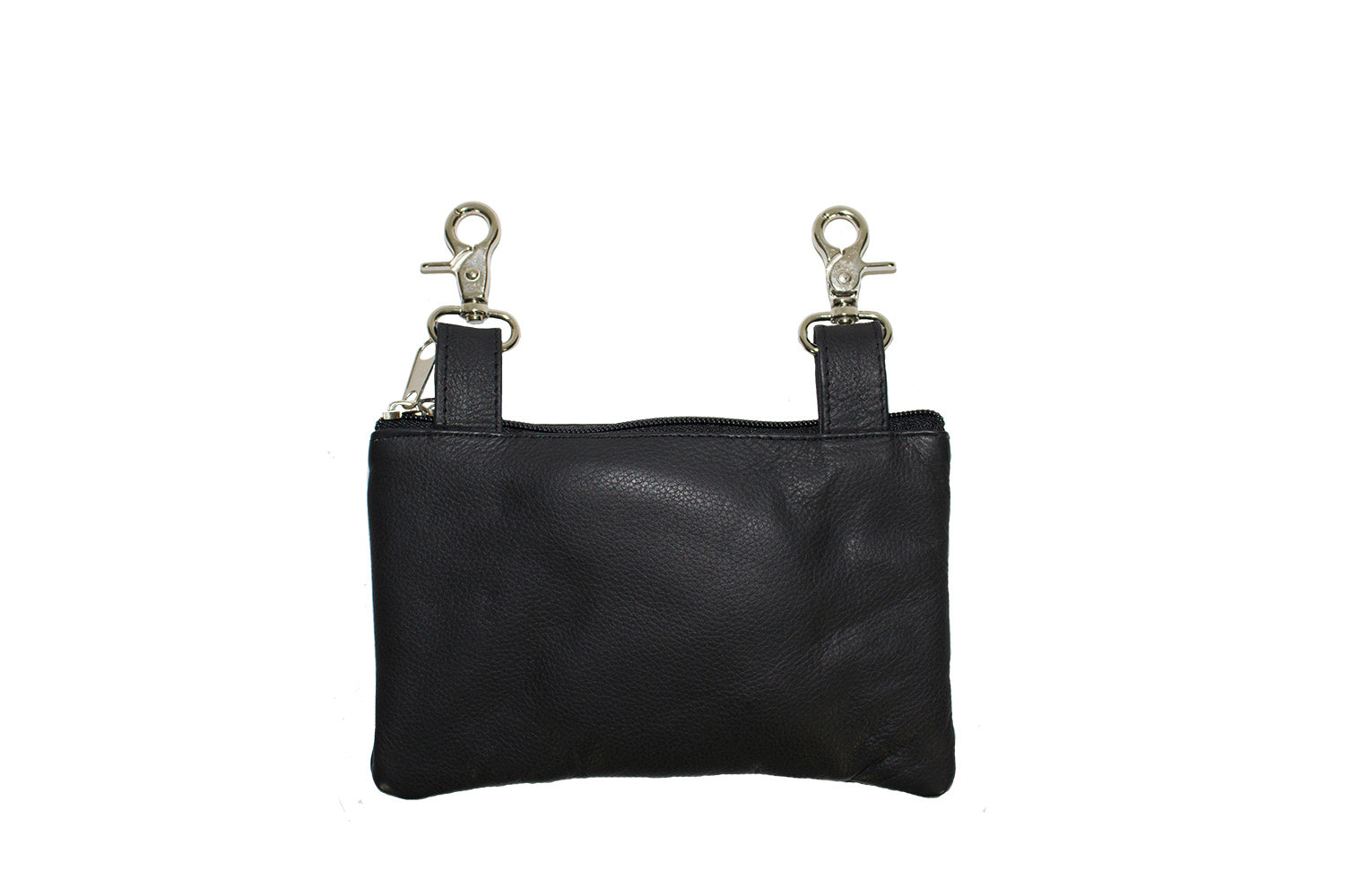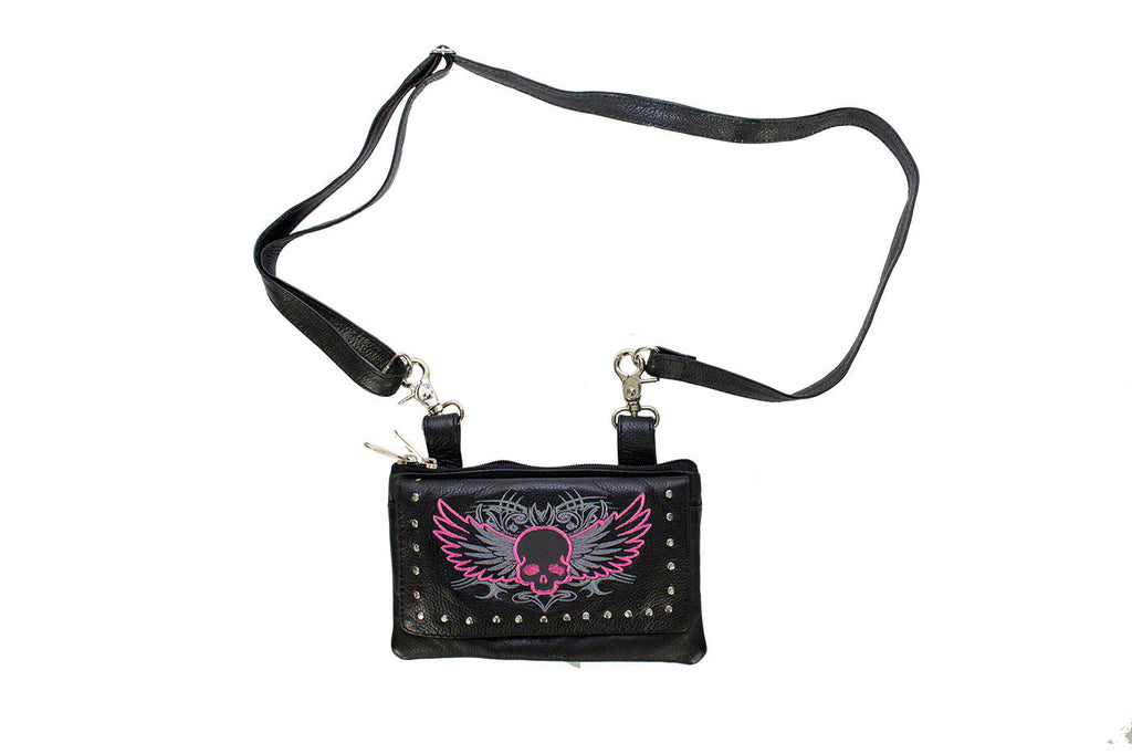 Our 8.5" x 5.5" naked cowhide leather hot pink flying skull belt bag with grey accents and bright chrome studs on the front flap pocket is the perfect choice for ladies on the go. The dual magnetic flap opens to reveal a roomy textile lined compartment large enough for an iPhone 6 while the two zippered compartments let you carry loads more. You can attach it easily to your belt loops with two large chrome lobster clasps or wear it over your shoulder with the adjustable strap that comes included. Show off your class, order yours today.