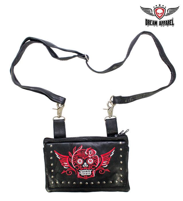 Dream Apparel's studded 8.5" x 5.5" all naked cowhide leather belt bag with a red and white Sugar skull and wings on the front flap is perfect for quick runs to the store or long runs to that favorite rendezvous. Two magnets open to reveal a roomy textile lined compartment large enough for an iPhone 6 while the zippered main compartment lets you carry loads more. You can attach it easily to your belt loops with two large chrome lobster clasps or wear it over your shoulder with the adjustable strap that comes included. Order yours today.