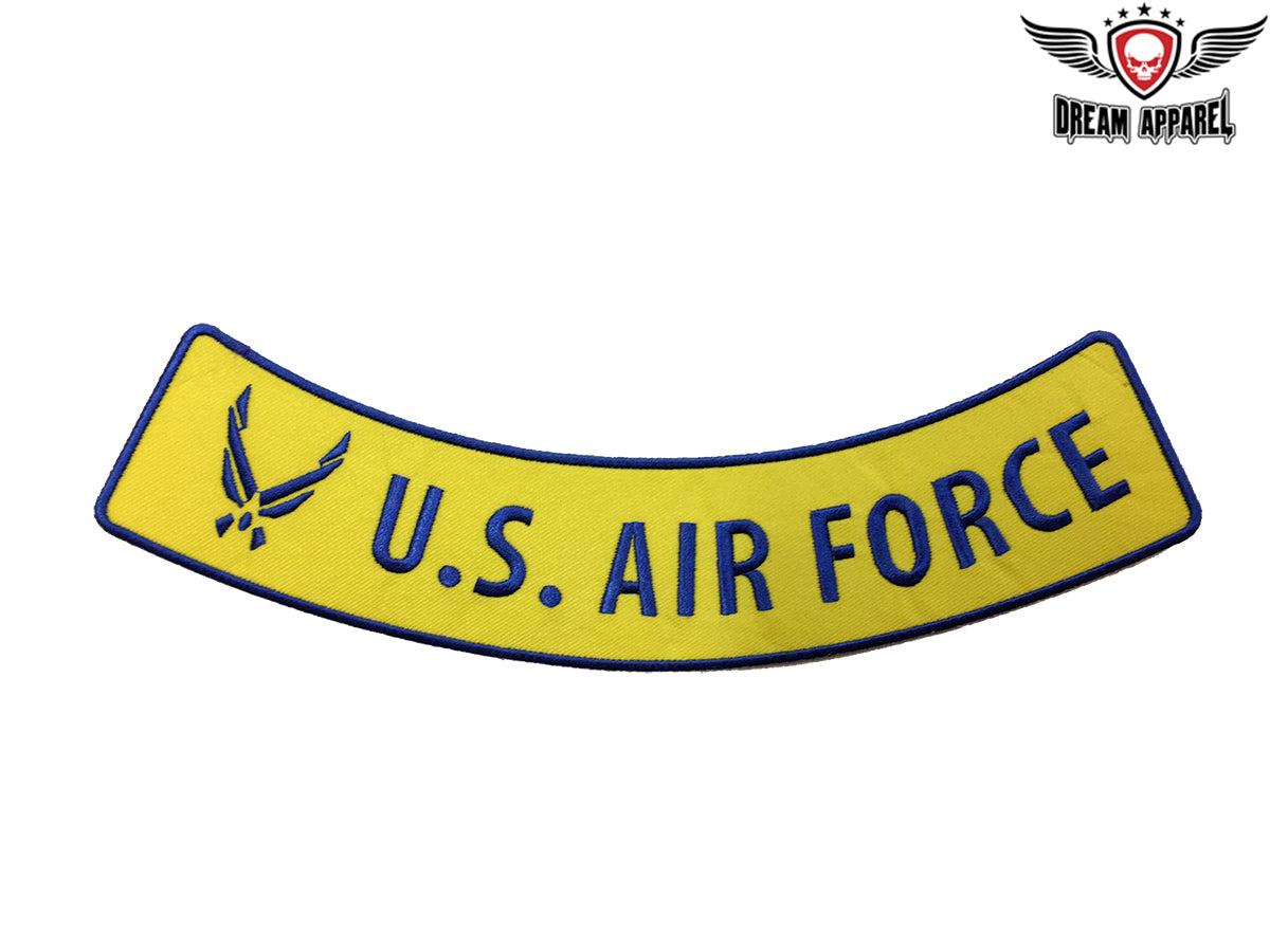 Take off and aim high with this bottom rocker by Dream Apparel. Measuring 2" X 9.75" with blue block lettering on a yellow background with a blue Air Force logo on the left and a blue border, this patch shows proudly that you or someone special protects our nation's skies.