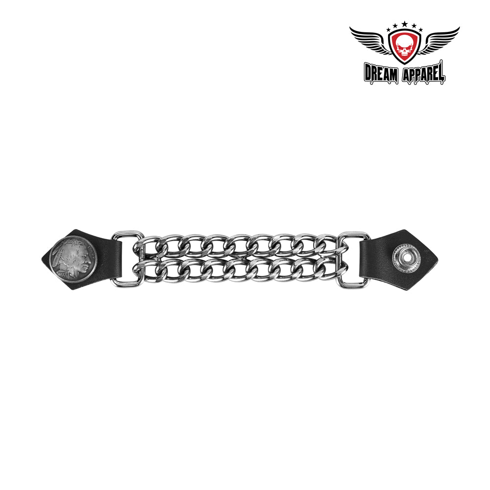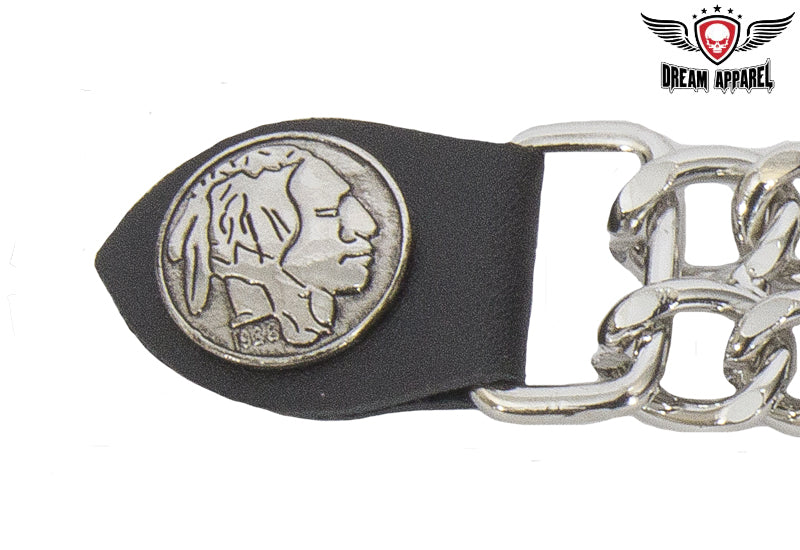 Sometimes you're just looking to have an extra piece of the pie and with our vest extenders, you'll have just that. Vest extenders are a great way to change up your look while still prioritizing on comfort and style. This features a Native American head which is on the obverse side of the buffalo nickel. The diamond cut chrome chain is extraordinarily strong, durable and the leather snaps are an eye-catching addition. Don't miss out, grab yours today!