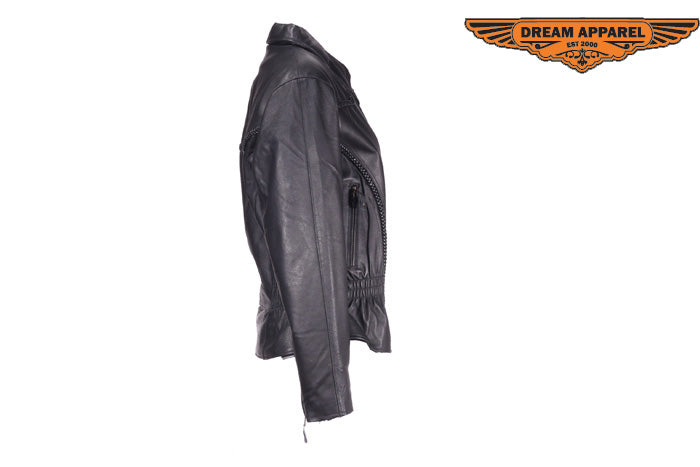 A first-rate jacket made from top-grade leather with a zippered lining that runs through the sleeves, stylish braiding on the front and back, multiple pockets, gathering at the waist and zippered cuffs for a great fit make this a great jacket for riding or going out on the town.