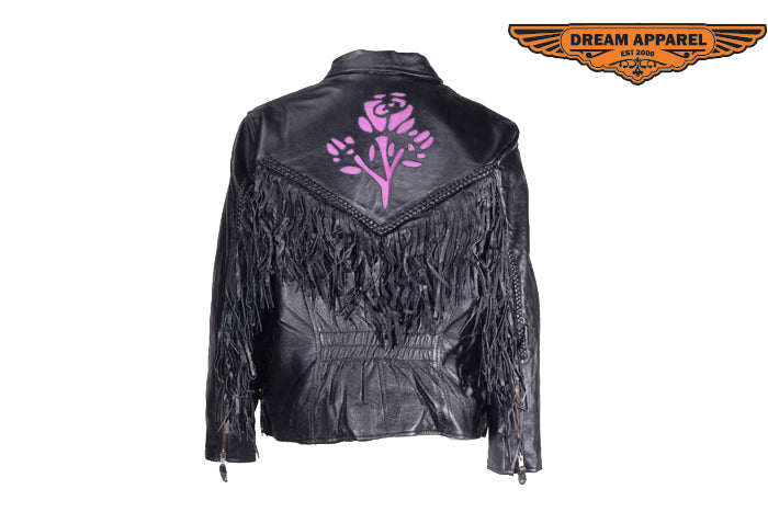 Heavy-duty, soft leather with the elegance of roses come together in this genuine Nake Cowhide jacket with a classic style, fold-down collar highlighted by two purple colored rose inlays on the front and one on the back. Fringes and braid decorate the front, back, and sleeves. The zip-up closure, quilted zip-out lining that runs through the sleeves and zippered cuffs make this jacket as comfortable as it is pretty while the multiple pockets make it a smart practical choice as well.