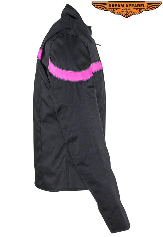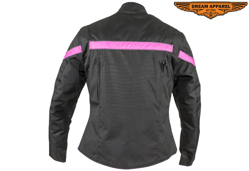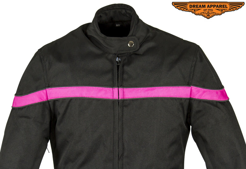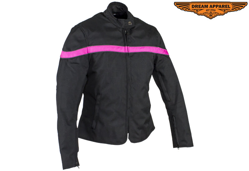 Dream Apparel has the perfect textile jacket for women riders who value safety as well as functionality. This jacket features a brilliant hot pink racing stripe running across the front, back, and shoulders with safety reflective piping bordering the stripe. You’ll relish the feel of the soft, quilted, full zip-out lining, the padded racing style collar with snaps, two zippered air vents under each arm, two additional vents on the back, a zippered front closure, and zippered cuffs. Your carry items will be well secured in two interior slip pockets with Velcro closures, an additional interior zippered pocket on the left, and two roomy zippered pockets on the front. Order yours today as these incredible racing jacket sell quickly.