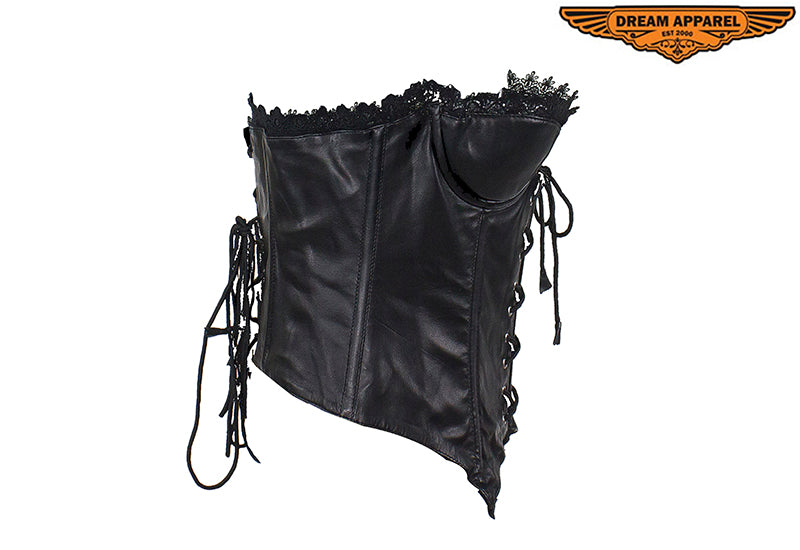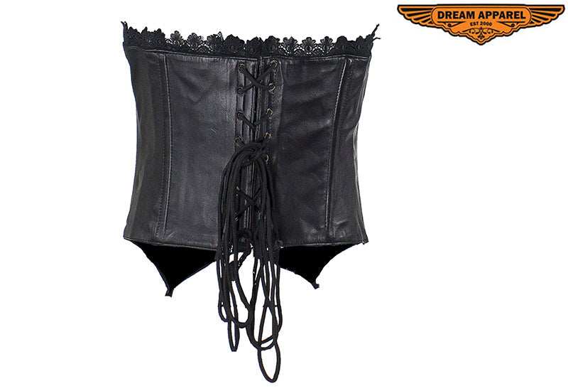 Our Women's Black Leather and Lace Corset is made from genuine black lambskin leather with an enchanting lace pattern that runs along the top edge and black laces that tie the front and back. With a soft textile lining and wonderfully finished with padded underwire bralets, elastic straps for added support, and vertical stays these amazing corsets won't stay around for long. Order yours today.
