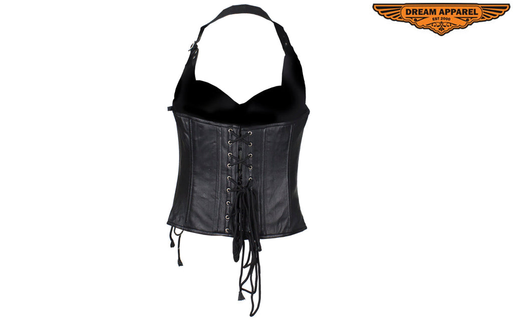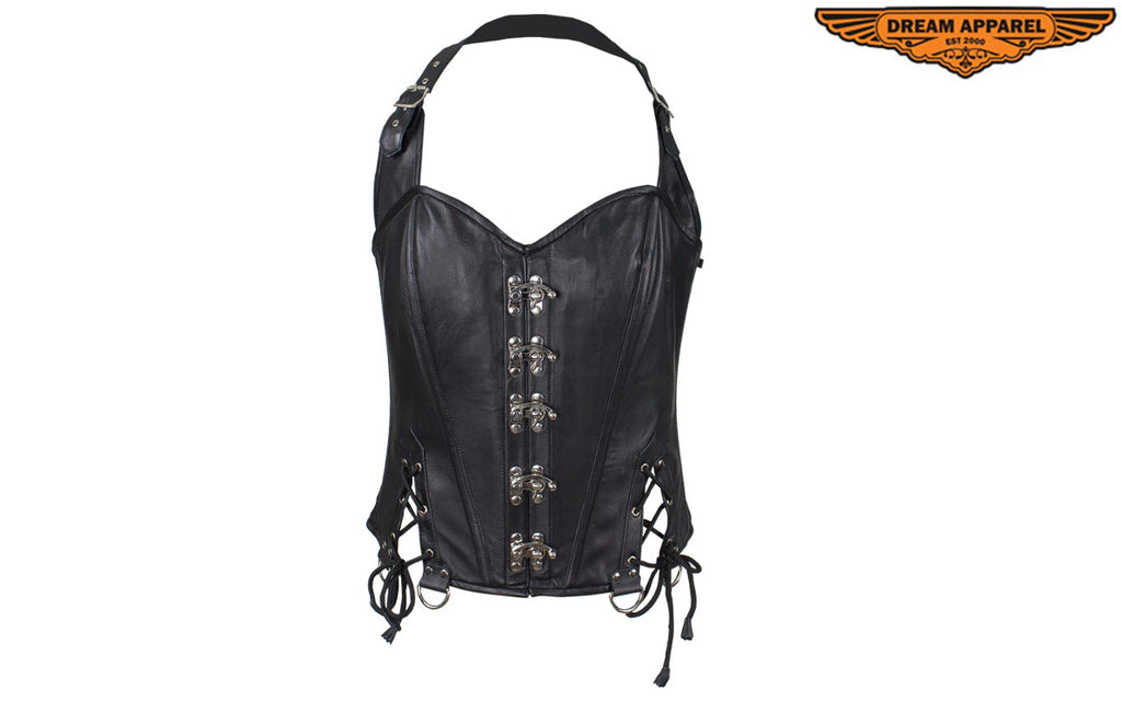 Ladies, this stylish black lambskin leather corset is terrific for anyone that wants to show off their curves and is made from genuine black lambskin leather with swing arm box latches that run down the front and reinforced pleating all around. Nylon laces tie up the back wrapping you in soft textile with additional nylon straps on the waist. It also comes with two tiny lace loops for hanging or attaching to your strapless bra, a leather strap with a roller buckle, and four polished metal d-rings on the waist. These trendy corsets are back so sure to order yours today.