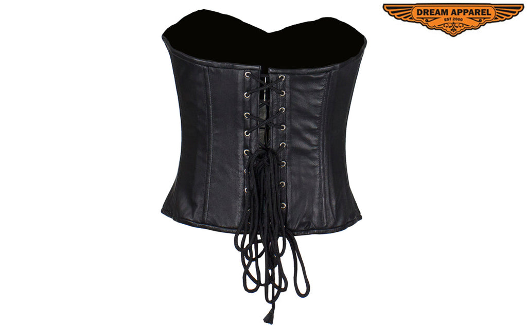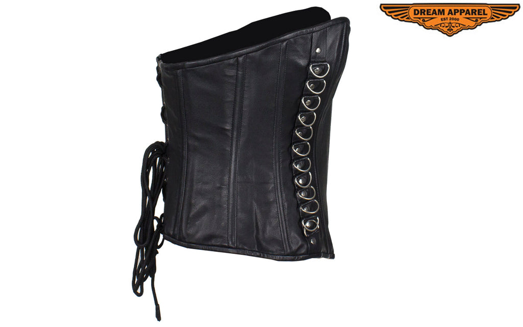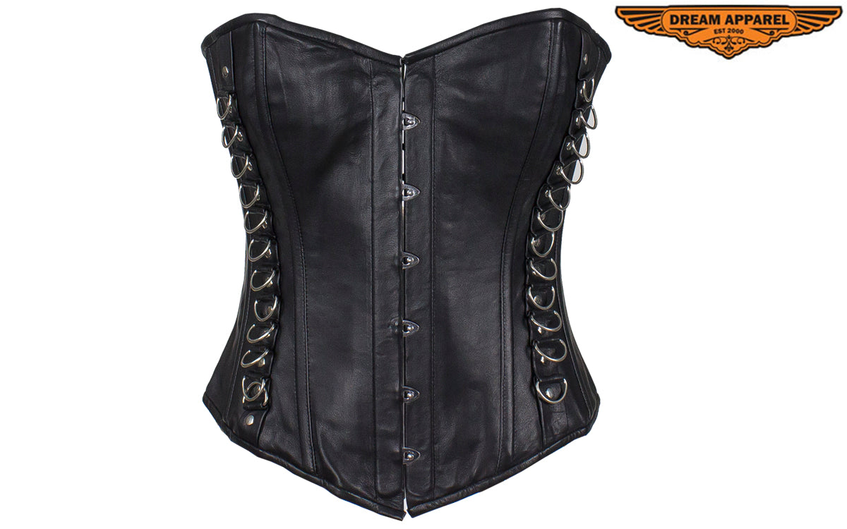 Some delightful things never go out of style. This fashion forward corset is made from genuine black lambskin leather and closes by a simple pin front closure down the front. Black nylon laces tie up the back, wrapping you in a soft textile lining. Polished metal d-rings let you hang a chain or other accessory from them while lace loops let you store it neatly or attach it to a strapless bra. Finished with reinforced pleating, these trendy corsets are very popular, order yours today.