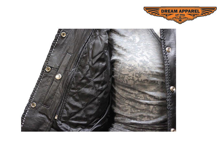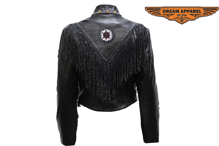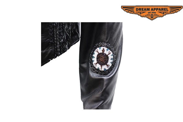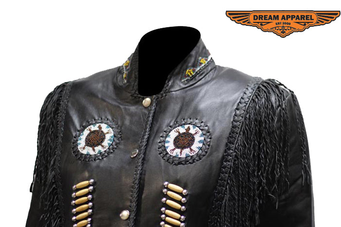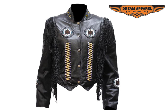 Women's Black Leather Jacket With Beads, Studs, Bone & Fringe