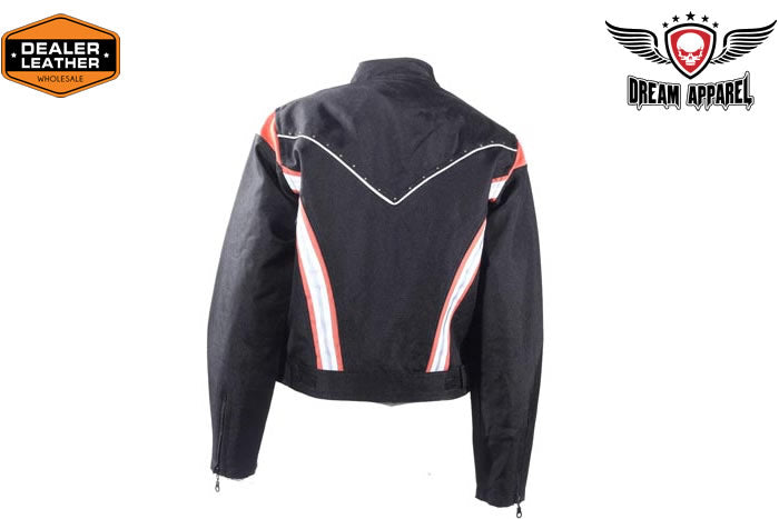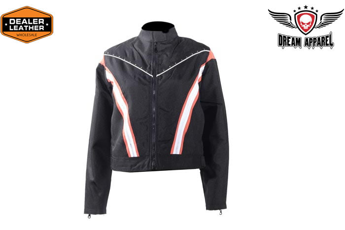 Ladies, you're able to really standout with our beautiful new black textile jacket featuring an orange and whitestripes as well as studs. The studs can be found going along the chest area. This jacket is really an eye catcher as it has a very unique exterior build and is both stylish as well as comfortable. The lightweight aspect of the jacket improves maneuverability as well as avoiding the bulky feel. Regular and zipout lining is found within the jacket. Standard pockets are on the waist of the jacket along with a hidden pocket on the inside. Lastly, the racer style collar really gives this piece the final touch needed to perfect it. Overall this jacket is a must have, especially for the ladies who like to be the talk of the room. So don't miss out, get yours today.
