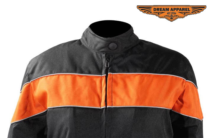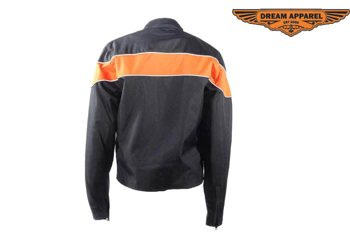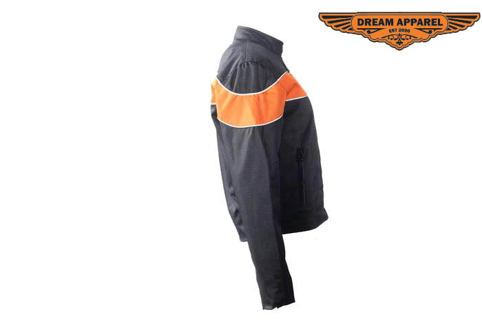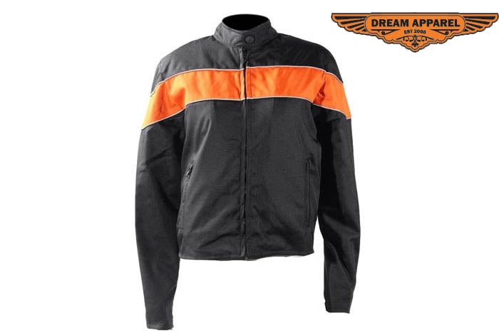 Ladies, this ones for you. Dream Apparel brings to you our beautiful black textile jacket with a thick orange stripe across the chest and back. The lightweight aspect makes this jacket very comfortable as well as great on the go. The increased maneuverability is definitely a plus. Along with that, this jacket is a very stylish option for the ladies.