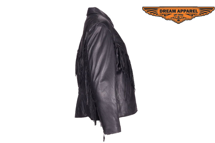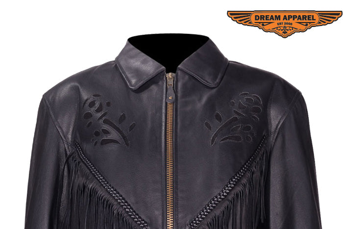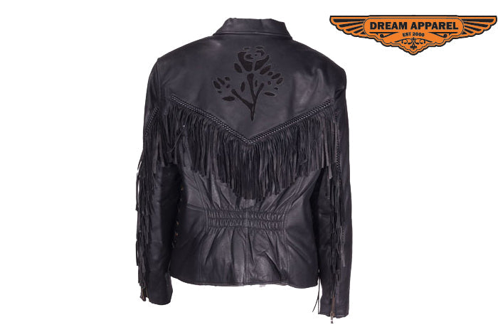 Ladies black rose inlay jacket is made from top grade genuine leather and features S/L & Z/O linings. Jacket also features a stylish black rose design and fringes along the sleeve. Jacket also includes multiple