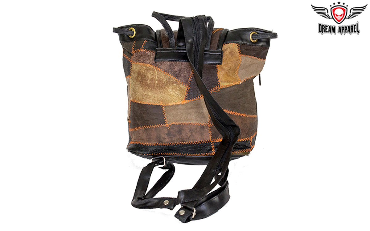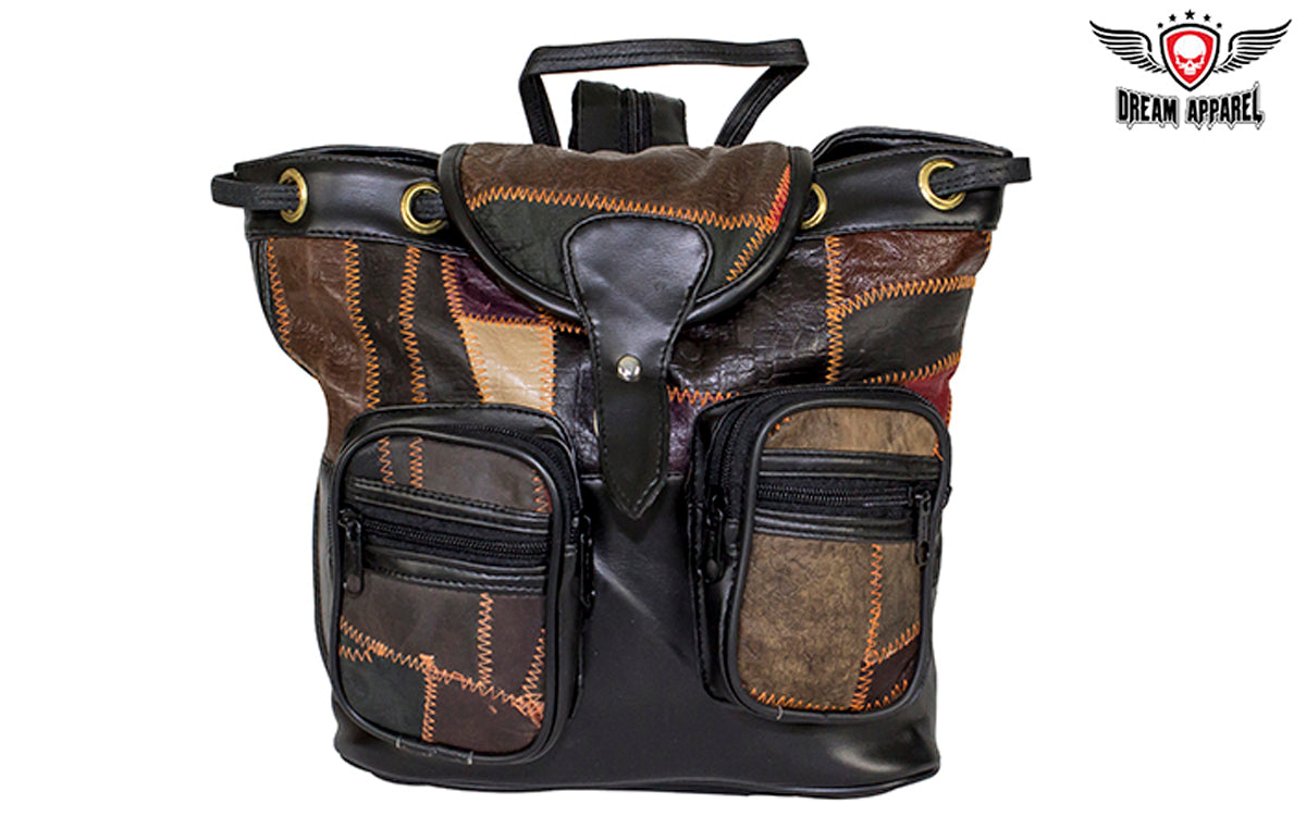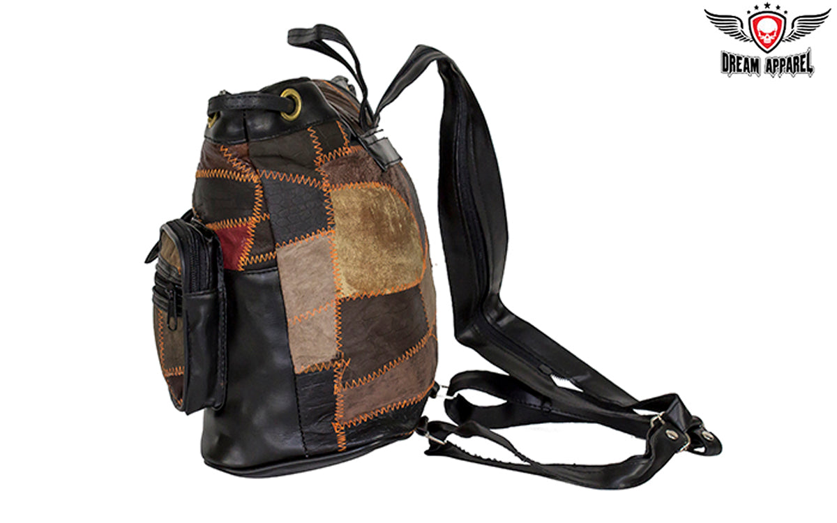 If you're looking for a stylish shoulder bag you can wear riding or dining out, our terrific leather bag is exactly what you're looking for. With two zippered pockets outside with an additional two zippered pockets on each of them, a really large zippered pocket on the side that runs the whole width of the bag, and one roomy zippered pocket on the black textile lining inside, you can bring everything you need. Designed in a stunning earth-tone patchwork leather design, additional features include a strong leather shoulder strap that can be used as a single strap or unzipped and doubled to be worn on both shoulders with a leather loop on top to make hanging easy. Tighten it up by the leather cord and close it with the duck tongue clasp and you can be sure you're ready for anything.