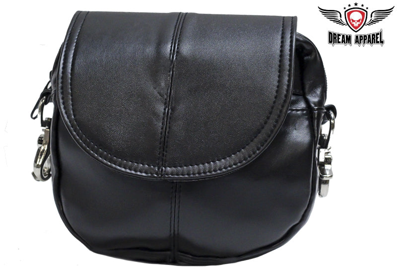 Dream Apparel's wonderfully simple classic black bag is perfect for short hops or a leisurely night on the town. Made from PVC, a large Velcro flap opens to reveal the zippered pocket on the front and roomy, fabric lined compartment. May be clipped to your belt loops by the two sturdy lobster clasps or worn over the shoulder with the PVC strap that's included. Our classic bag makes the perfect accessory for fun or formal evening wear so order yours today.