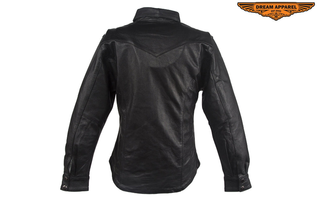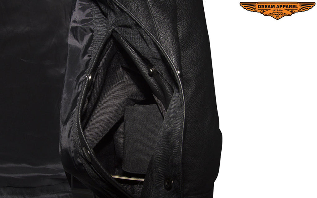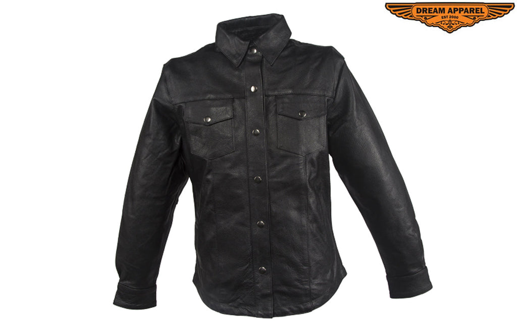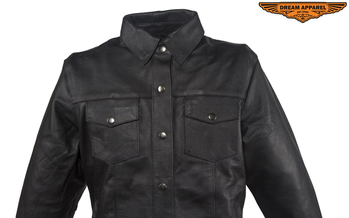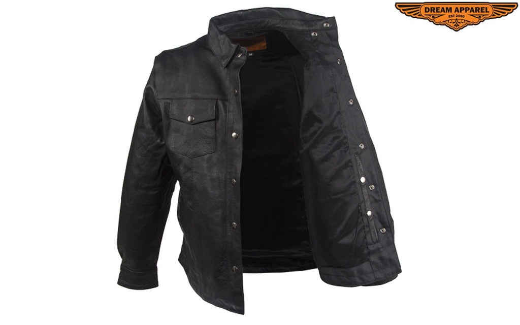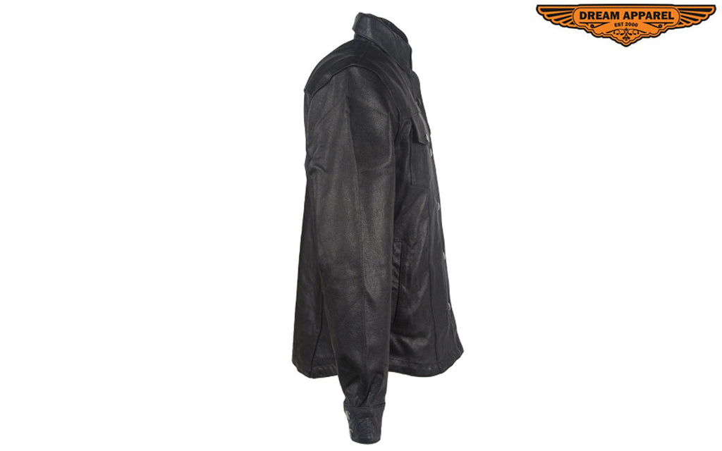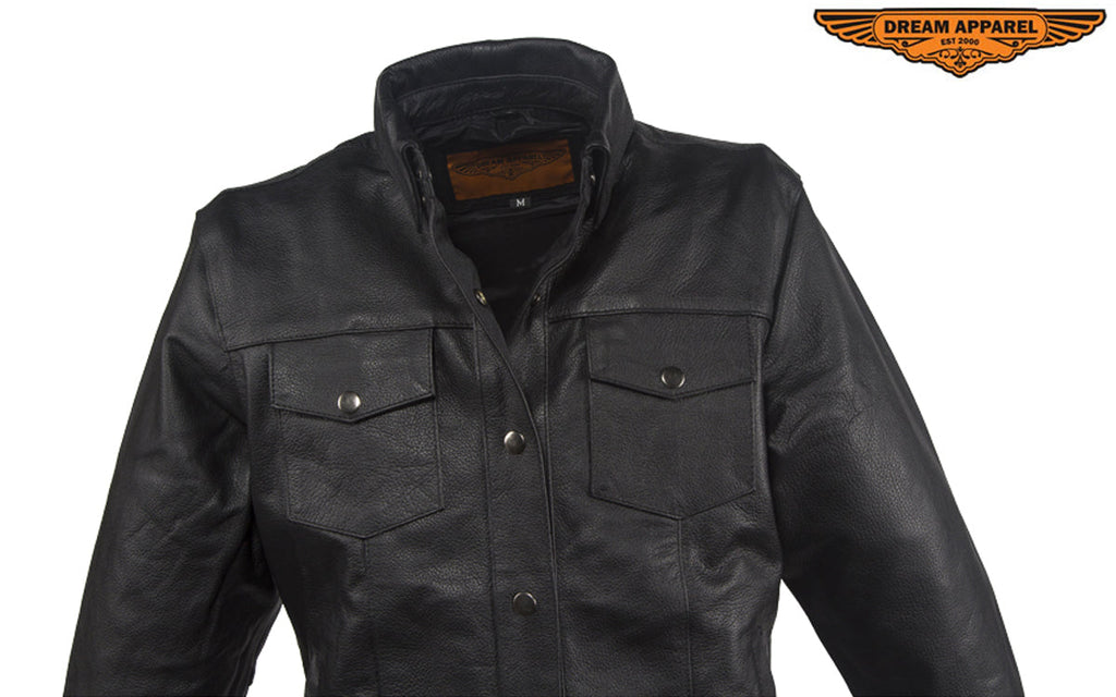 This straightforward, soft, leather jacket with fold-down collar makes a great addtion to your biking wardobe. Button yourself up in comfort in a soft, nylon lining with button-snap cuffs and front closure. Plenty of pocket space is provided by two roomy concealed pockets and two additional zippered pockets inside. The two big front pockets with button-down flaps complete the look of this terrific leather at an unbelievable price.