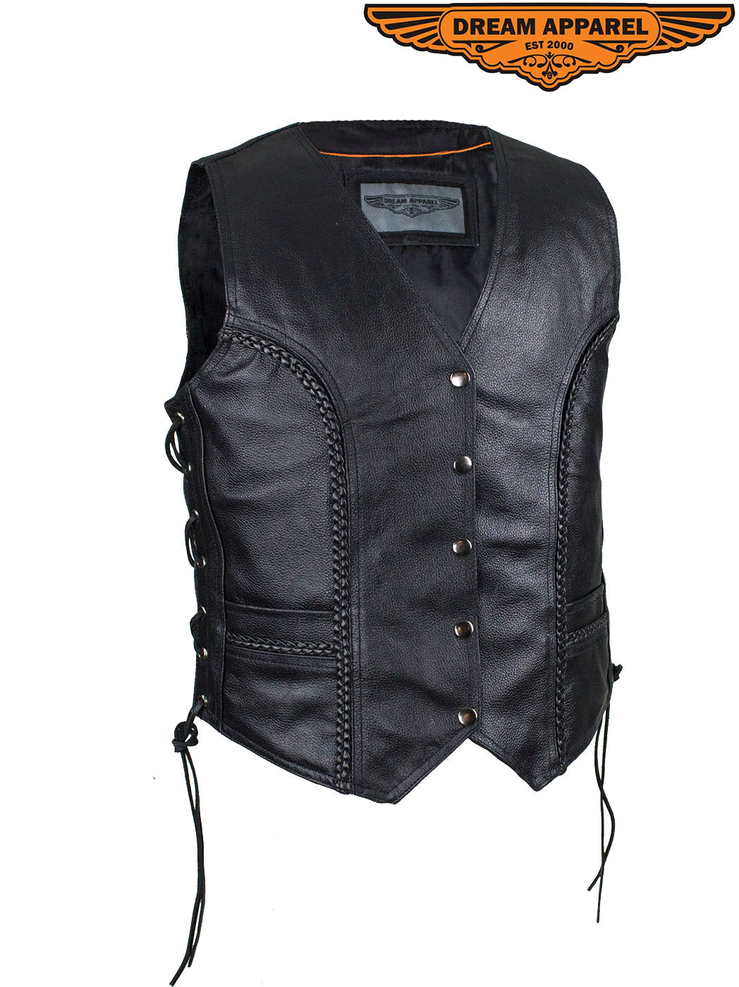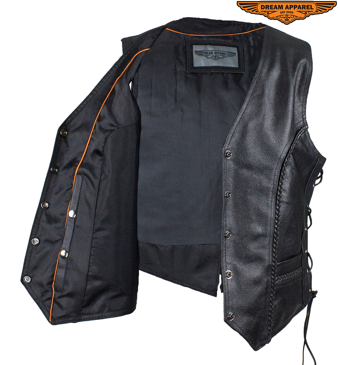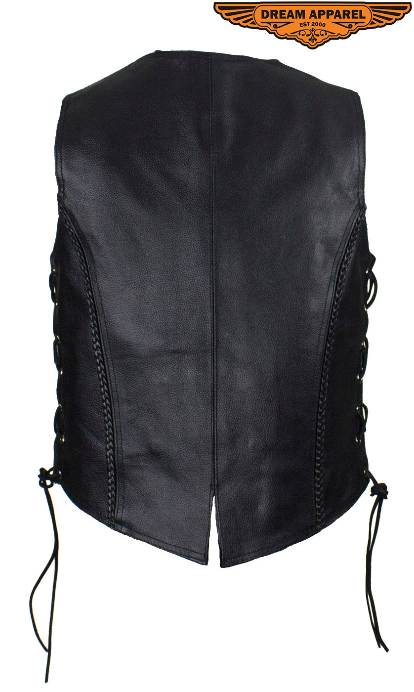 It won't matter if you're on the road or about town, you'll look good and feel great in our top-grade, genuine Soft Touch leather vest. This Classic style vest features ornamental braiding, multiple pockets inside and out, a smooth nylon lining, four button snaps, side laces, and additional length to cover the midsection making this vest comfortable and a great value.