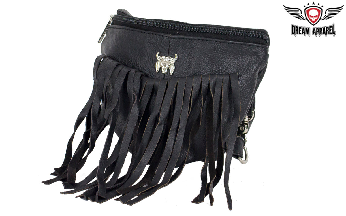Dream Apparel's Classic Western belt bag makes the perfect accessory for either short trips or an evening out with friends. Made from leather and featuring long threaded fringe along the front of bag and a silver steer skull and feathers above the fringe. You can carry all your personal items safely and securely in the large zippered pocket that's lined by a soft textile fabric. Thanks to the two sturdy lobster clasps, it may be worn on the waist or over the shoulder by the leather strap that's included. This simple bag makes the perfect accessory for fun or formal wear, so order yours today.