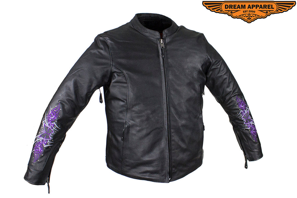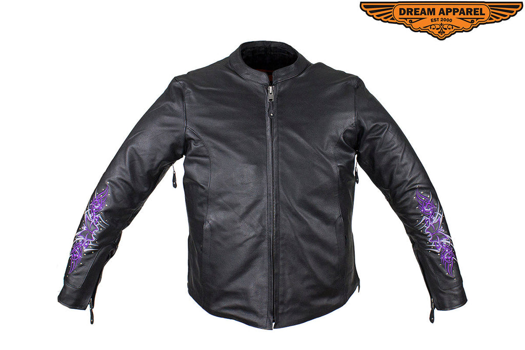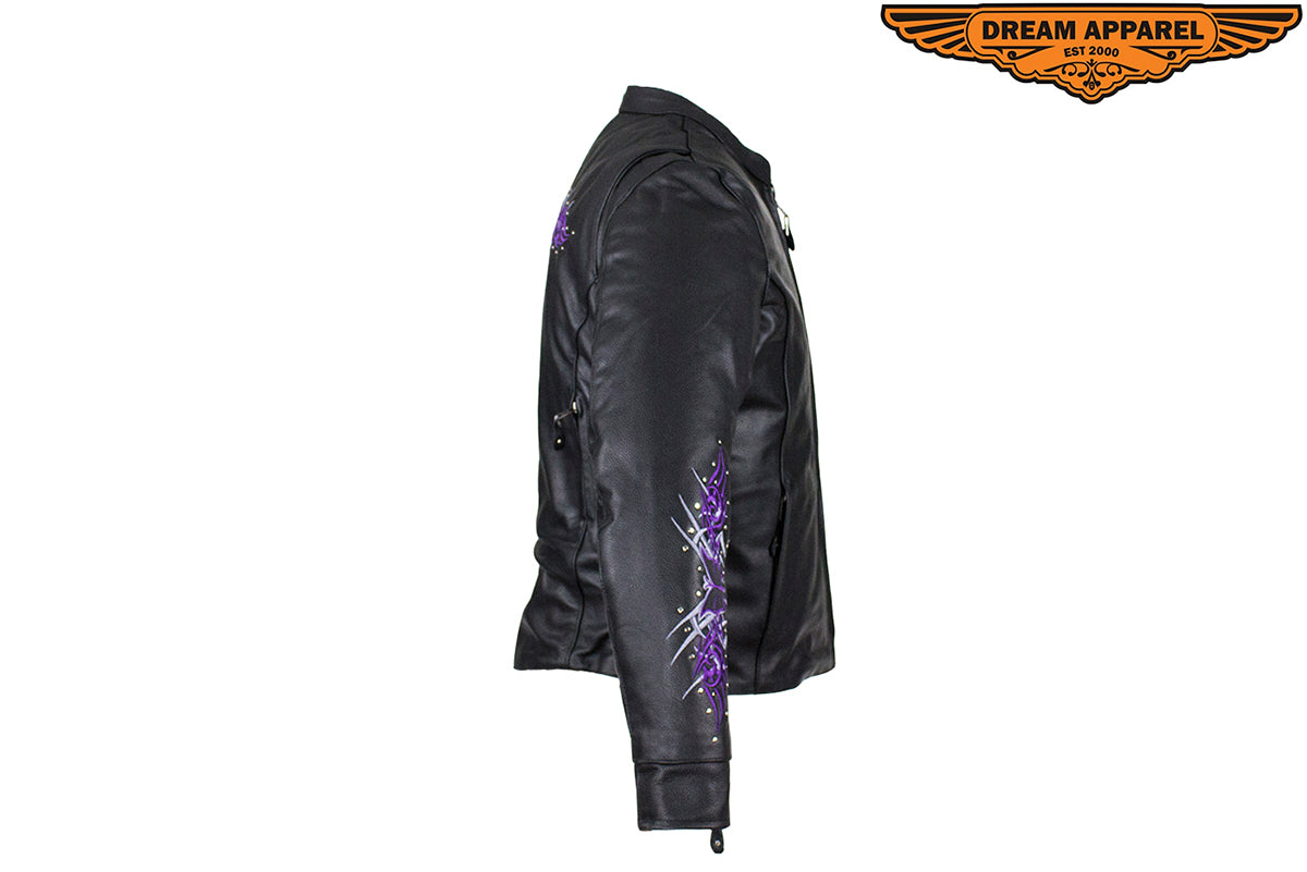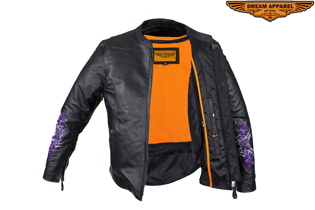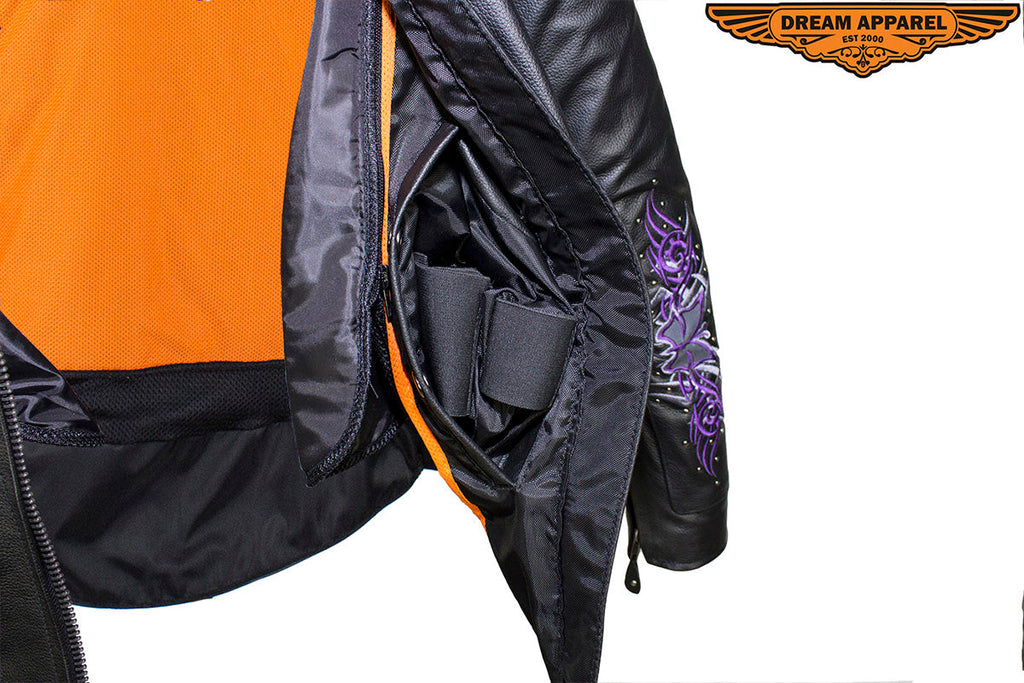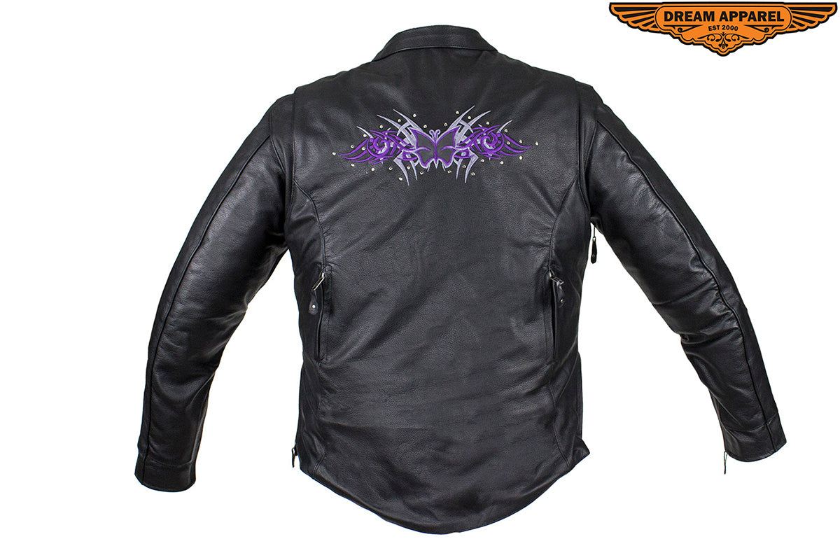 This beautiful naked cowhide leather jacket for women featuring a purple butterfly graphic on the back and sleeves is a must have. There are two concealed carry pocket as well as two waist pockets. The fit is great and you'll never wanna take it off, as it is both stylish and comfortable. Grab yours now!