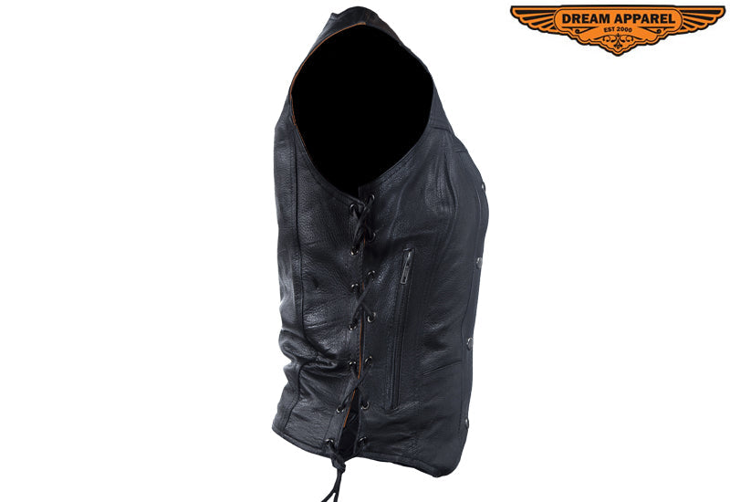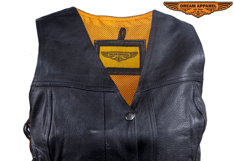 Your bike and the clothes you wear tell everyone that only the best will do for you. This vest, made with the highest grade Naked Cowhide, comes with concealed pockets on both sides with button snap closures. You'll feel as comfortable as you do safe with side laces for adjustable fit, button snaps, and the polyester and nylon lining. Want to bring along some extra items for the trip? We covered that also with two front stash pockets, two front pockets with zipper closures, two inside pockets with zipper closures, and two without. Since we knew you'd be so proud to wear this vest we left the back panel solid so you could display your club's badges and colors.