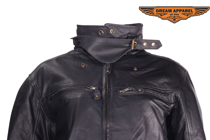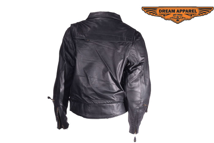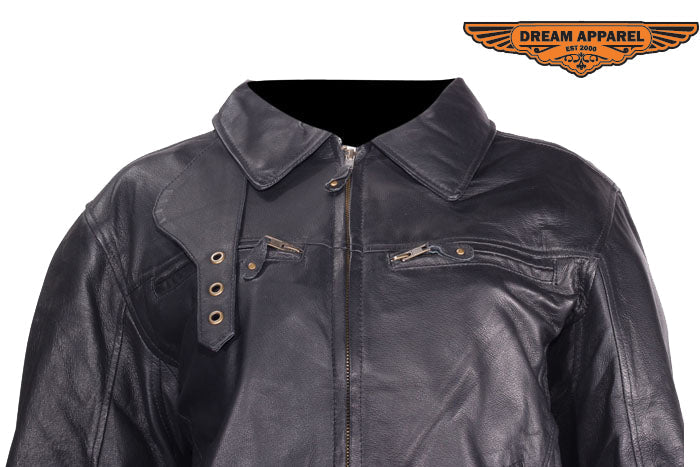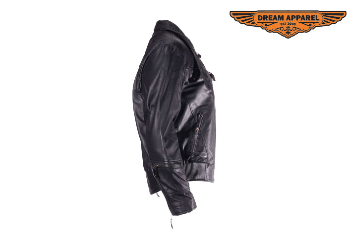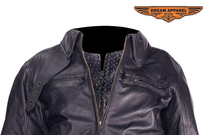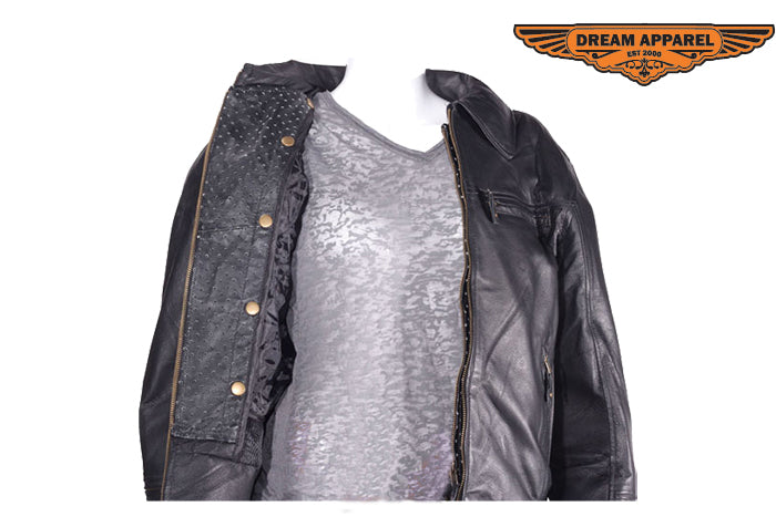 This amazing womens leather jacket features beautiful airvents on the sleeves and on the back of the jacket. Snap down collar gives this jacket the stylish and fashionable look that all women look for. Don't lose the chance, go get yours now!