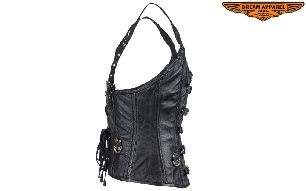 This sexy black corset is perfect for anyone that wants to spice things up. Made from genuine black lambskin leather with brushed metal buckles to adjust the shoulder straps, a zippered front closure, and five brushed metal buckles with leather straps that lay across the zipper. Matching black laces tie up the back, wrapping you in a soft textile lining that includes a soft flap that covers laces. Two polished metal d-rings hang from the waist allowing you to drape a delightful chain or other accessory from them. These trendy corsets are very popular so order yours today.
