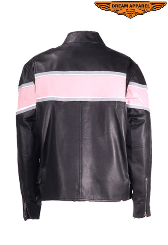 - Broad pink racing stripe runs across front, shoulders, and back
