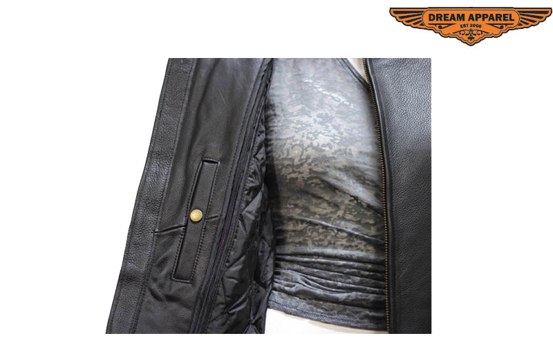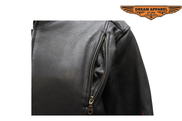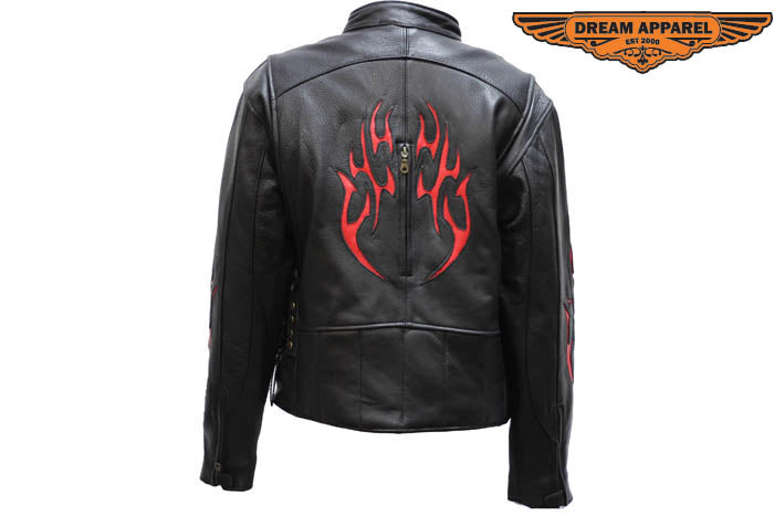 Amazing quality leather jacket for women with a Z/O lining, fashionable flame on sleeves and back, 2 airvents, back side laces and zippered cuffs for maximum fitting, and multiple pockets all at a great low price!