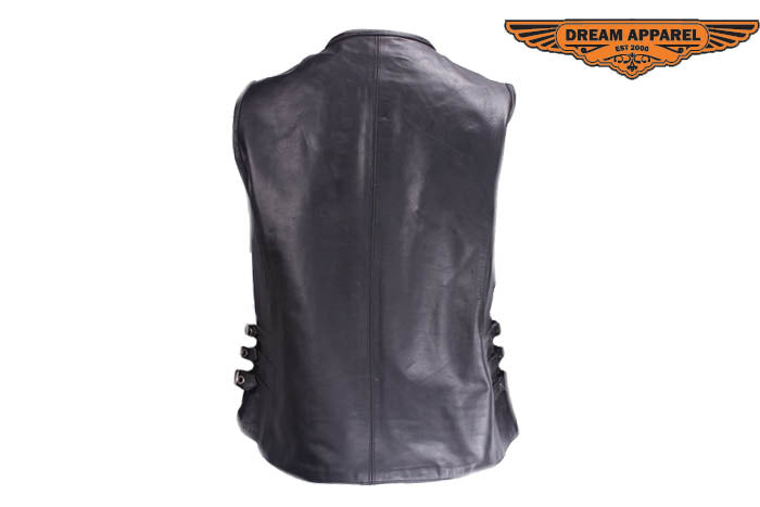 Pull up in style wearing this sleek genuine leather vest. Two pockets on the outside and two inside provide ample room for any trip. The three buckles on each side and zippered front allow you to adjust the fit making this a great choice for comfort and quality.