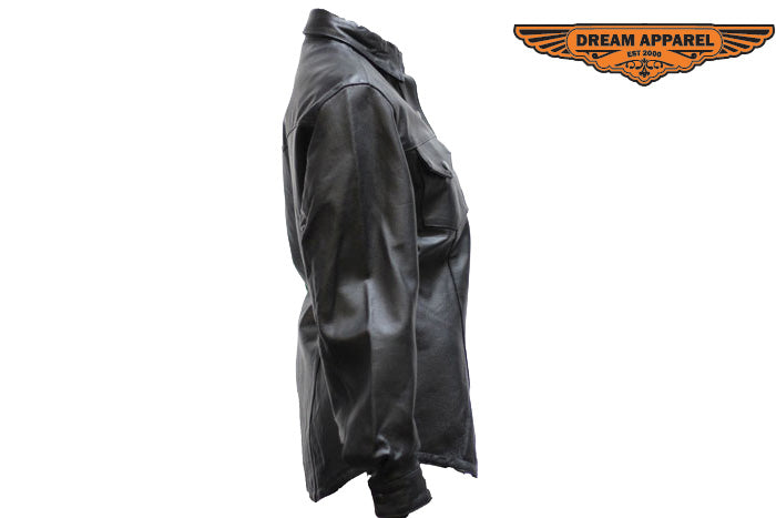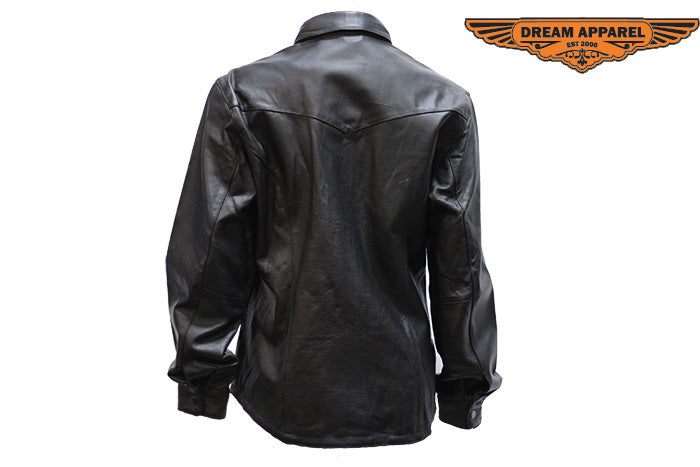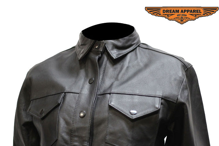 This straight forward, soft, genuine nappa leather jacket designed in a classic, buttoned shirt style featuring two front pockets and a smooth, full nylon lining inside is terrific for a road trip or a night out with friends.