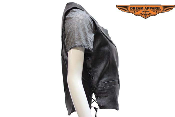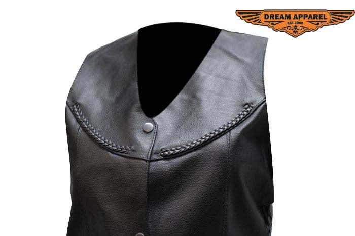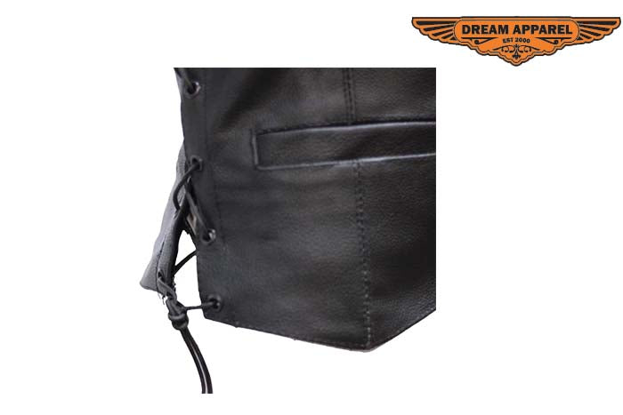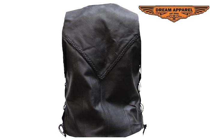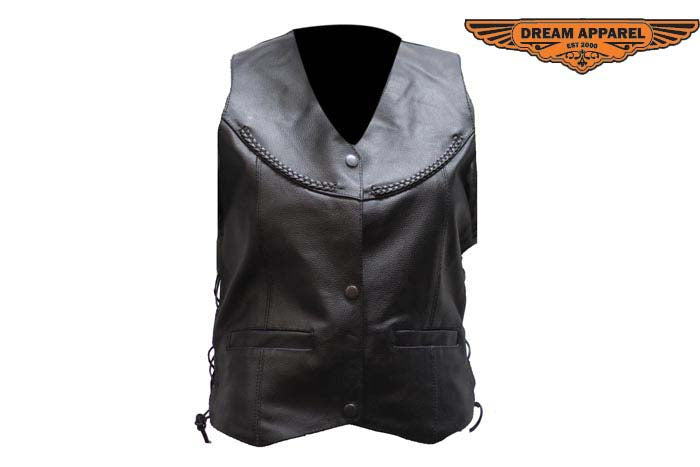 If you're a biker babe who loves the open road or just loves the traditional fashion of a Leather vest then we have you covered. Three standard front button snap closures, smooth nylon lining and side laces make it easy to slip on and adjust to your comfort. This traditional vest has a stylish leather braid front to back and chrome Conchos on side laces will make you stand out from the crowd. Front slip pockets and large inside pockets can carry all the things a girl needs to ride, shop, or party.