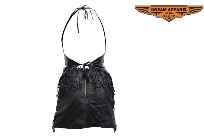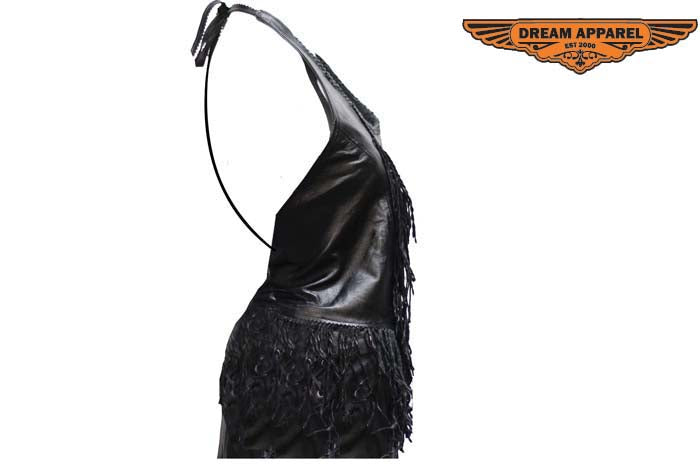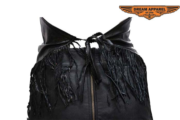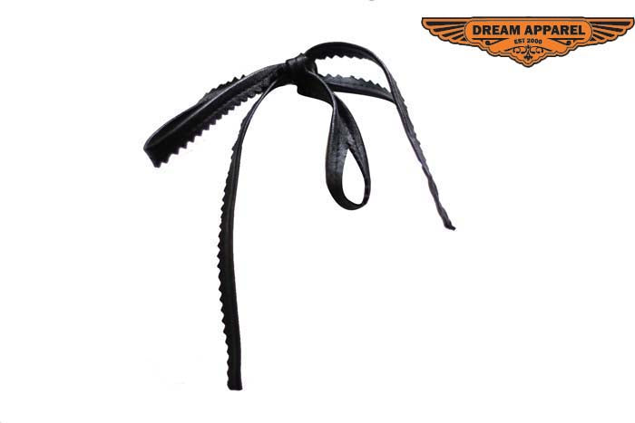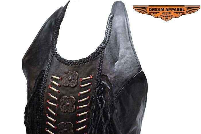 This top-grade, genuine leather vest includes a stylish bone, red bead, and stud design bordered by fine black braiding down both sides on the front and back. The leather ties in the back to give this stunning vest a sensual look that's sure to turn heads.