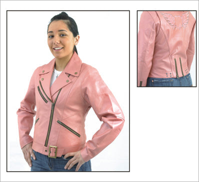 Awesome ladies jacket in pink is made from top grade leather with Z/O lining that runs through the sleeves can be yours at a great low price! Jacket also features a snap down collar, multiple pockets, half belt and zippered cuffs for great fitting.
