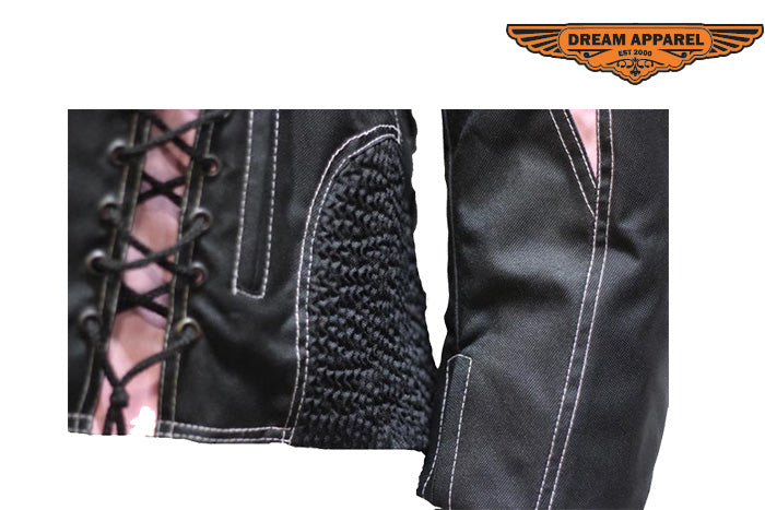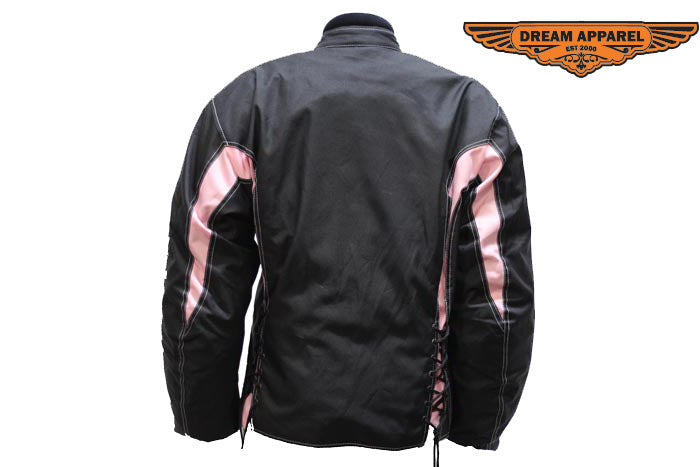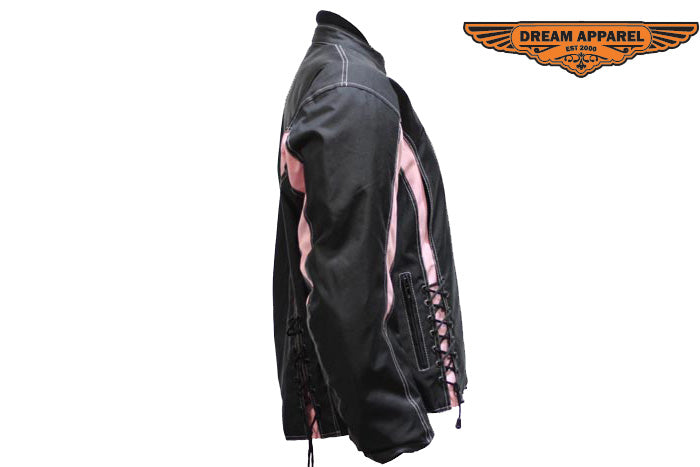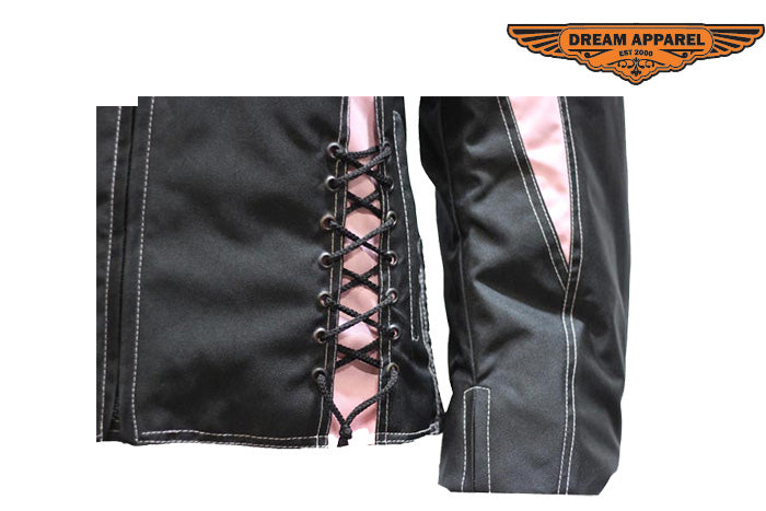 Our womens pink textile jacket features two laces on the front and on the back of the textile jacket. The multi pockets inside and outside allow the women riders to store anything that is needed for the road closely to the rider.