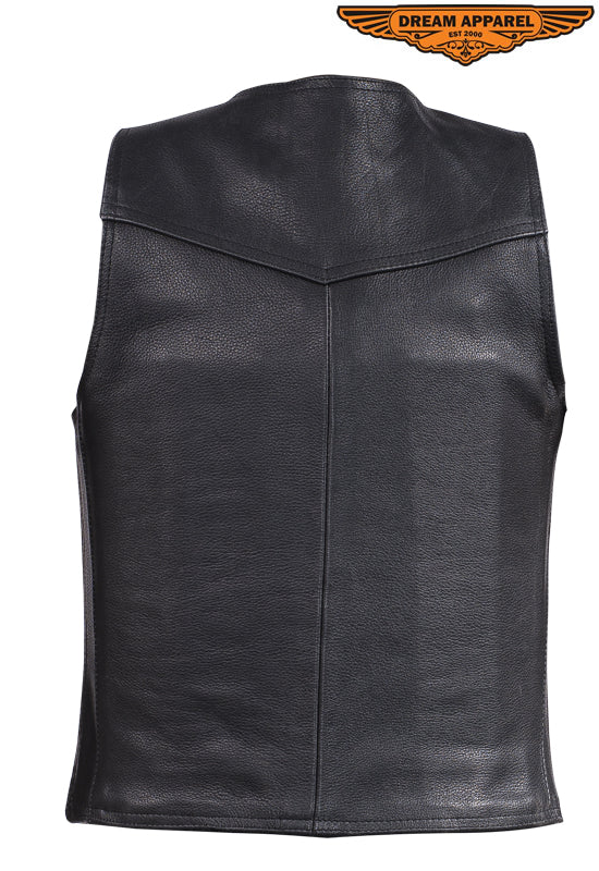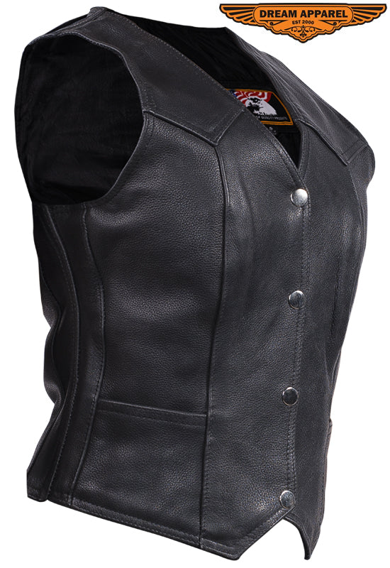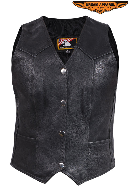 This genuine leather vest is cut in the traditional style, designed with women motorcyclists in mind for everyday use. The vest features three solid snaps and two stash pockets for a clean look at a great price.