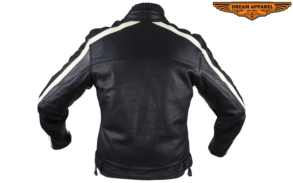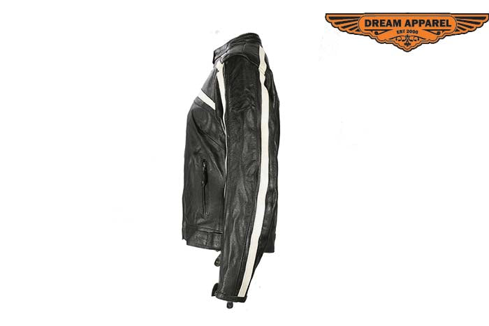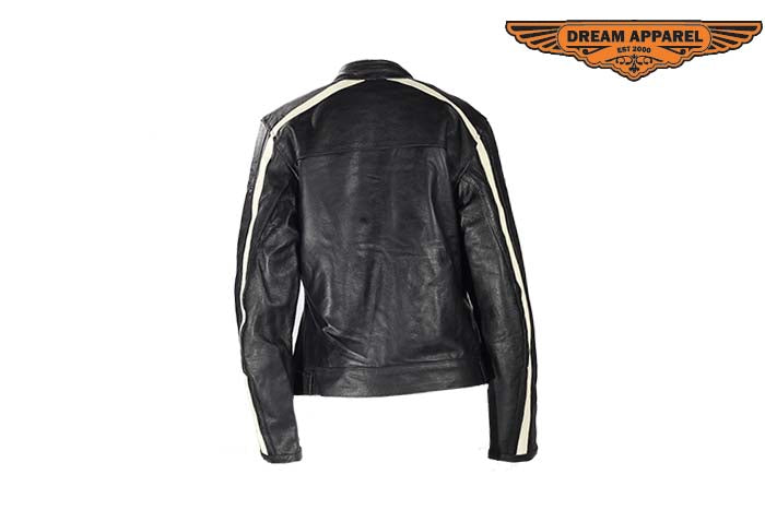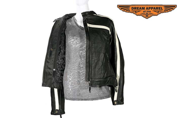 Foxy ladies ride tough and need a jacket that suites their sassy attitude, Dream Apparel works hard at designing gear that is functional and stylish for the biker babes who want protection and charm on the next cruise. High quality Racer leather jacket cut to complement the female figure, with stylish white leather stripes and a sleek collar with multiple button snaps makes this jacket simple and sweet. With 2 front pockets and 3 inside pockets this jacket can hold multiple items. Zipper and button snap cuffs down to waist side zippers with Velcro leather straps you ladies can wear jacket to desired fit. Full sleeve zip-out liner makes this jacket perfect for fluctuating temperatures, so keep it classy foxy ladies and don't ride without Dream Apparels high quality Racer leather jacket.