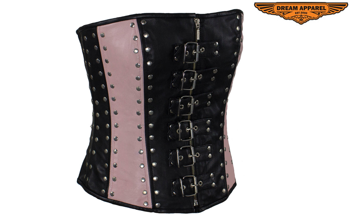 This trendy corset is made from genuine pink and black lambskin leather with a zippered front closure, leather straps with brushed metal buckles laying across the zipper, and laces that tie up the back to wrap you in the wonderfully soft textile lining. Finished by two small lace loops for hanging or attaching to a bra and two rows of ¼" brushed metal studs that run all around make this fashion forward corsets a very popular item. Make sure to get your order in before they're gone.