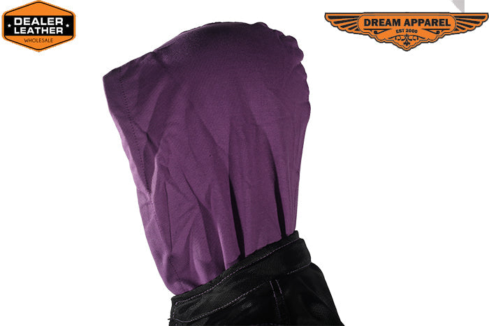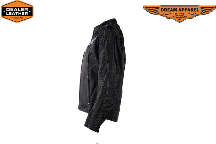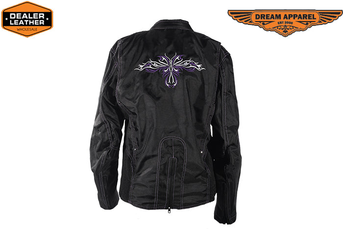 Foxy ladies ride tough and need a jacket that suites their sassy attitude, Dream Apparel works hard at designing gear that is functional and stylish for the biker babes who want protection and charm on the next cruise. Our women Textile Mesh Nylon Jacket is made out of durable long lasting nylon material, with reflective piping, purple stitching and multiple embroidered purple n white butterflies you ladies will look great at any occasion. Zipper on back hem, elastic sides and elastic panel with zipper cuffs insure function and multiple pockets for storage make this jacket superior. Multiple air vents with zipper closures and a purple full sleeve zip out liner make for all season riding. More than a zip out liner, this purple liner is a sweatshirt/hoodie with front pockets and thumb holes at cuffs for use with or without jacket. This women Textile jacket will please any lady on her next motorcycling mission.