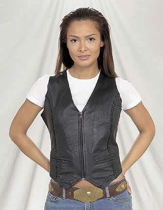 Whether you're a biker or a women that loves the feel of soft nappa leather then we have you covered. The brass standard front zipper closure opens to a smooth nylon lining for comfort and makes it easy to slip on. The stylish leather braid front to back gives it a clean and simple look. Front slip pockets and multiple inside pockets can carry everything you need making this vest a practical and affordable choice at a fantastic price.