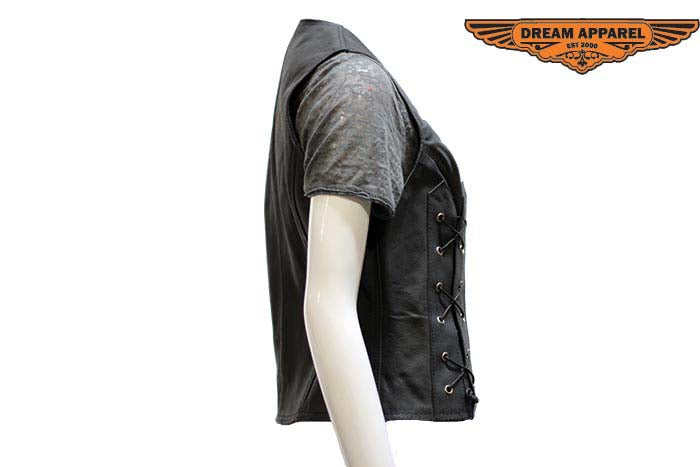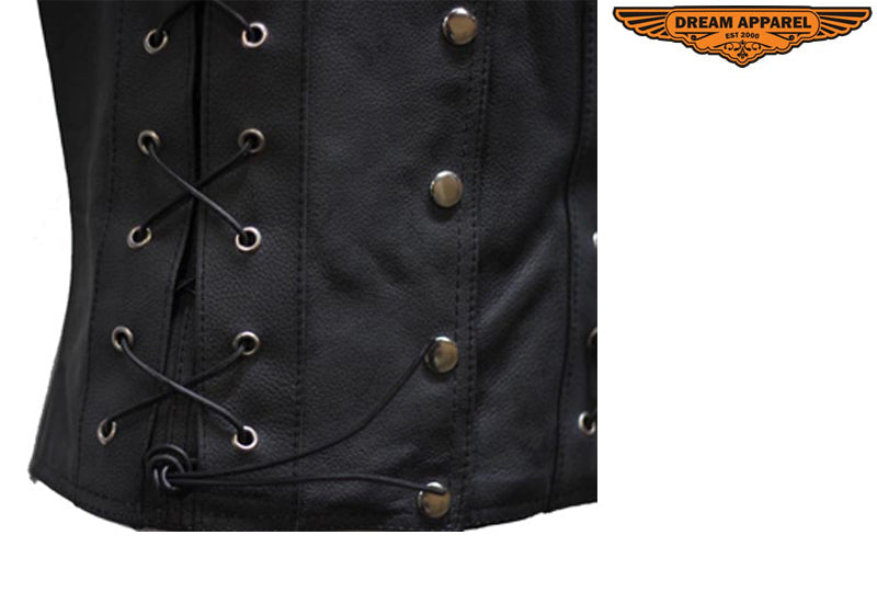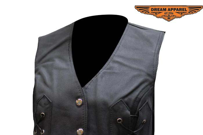 This fantastic ladies vest made from top-grade genuine leather with nylon lining can be yours at a great low price. Our stylish Vest also has multiple pockets, five snap buttons, and side lacing for a great fit and great value.